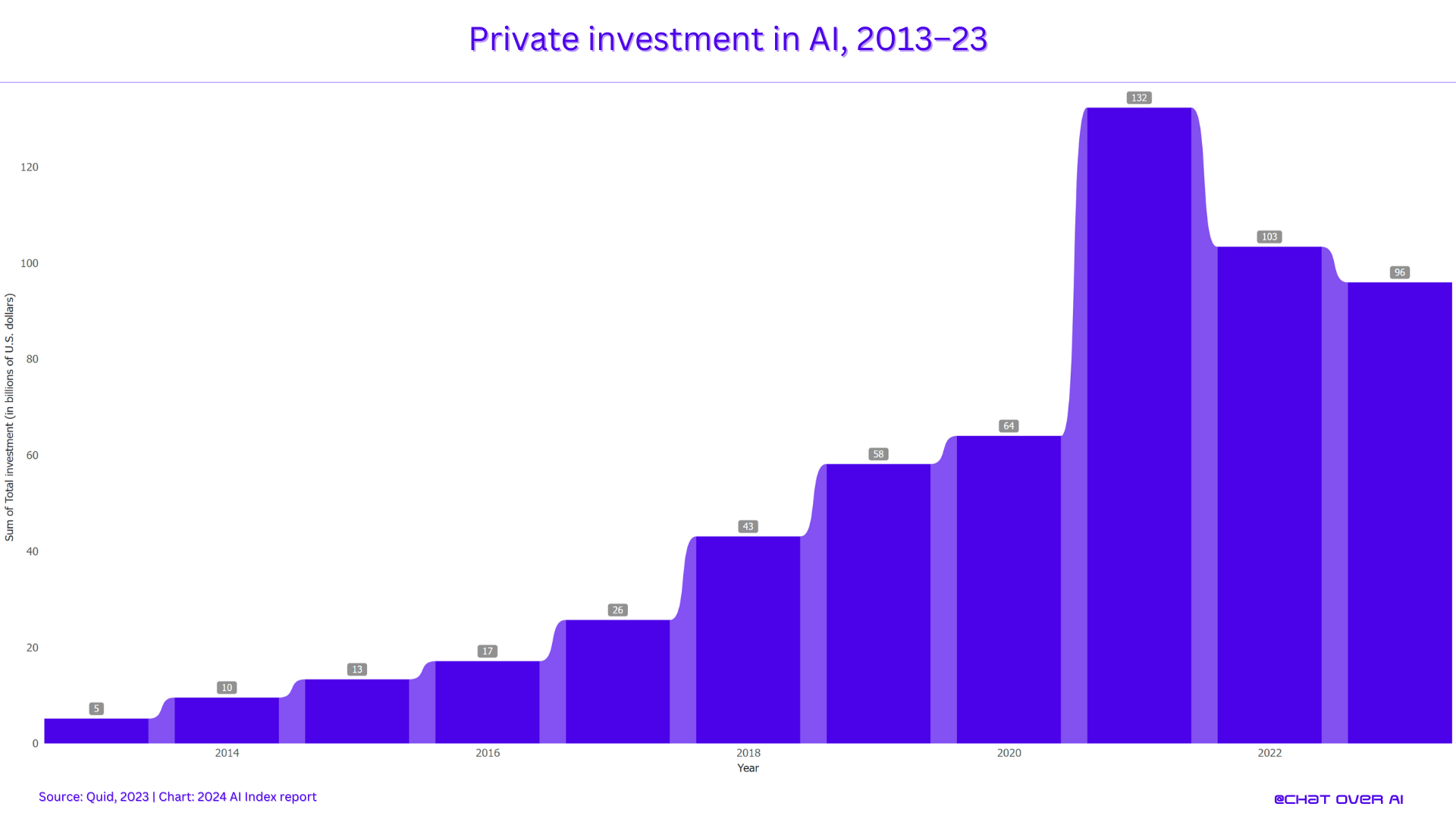 Private investment in AI has also experienced a bit of a slowdown, but nothing too dramatic. The drop from 2022 to 2023 was a modest -7.2%. To put it in perspective, it’s like going from having a full tank of gas to having three-quarters left—still plenty to go around. Over the last decade, though, we’ve seen a meteoric rise in private investment in AI. Back in 2013, it was a cute $5 billion, and now we’re talking $96 billion. So, despite some bumps along the way, the trend is still headed up—and those investors are clearly still into AI, even if the honeymoon phase has mellowed out a bit.