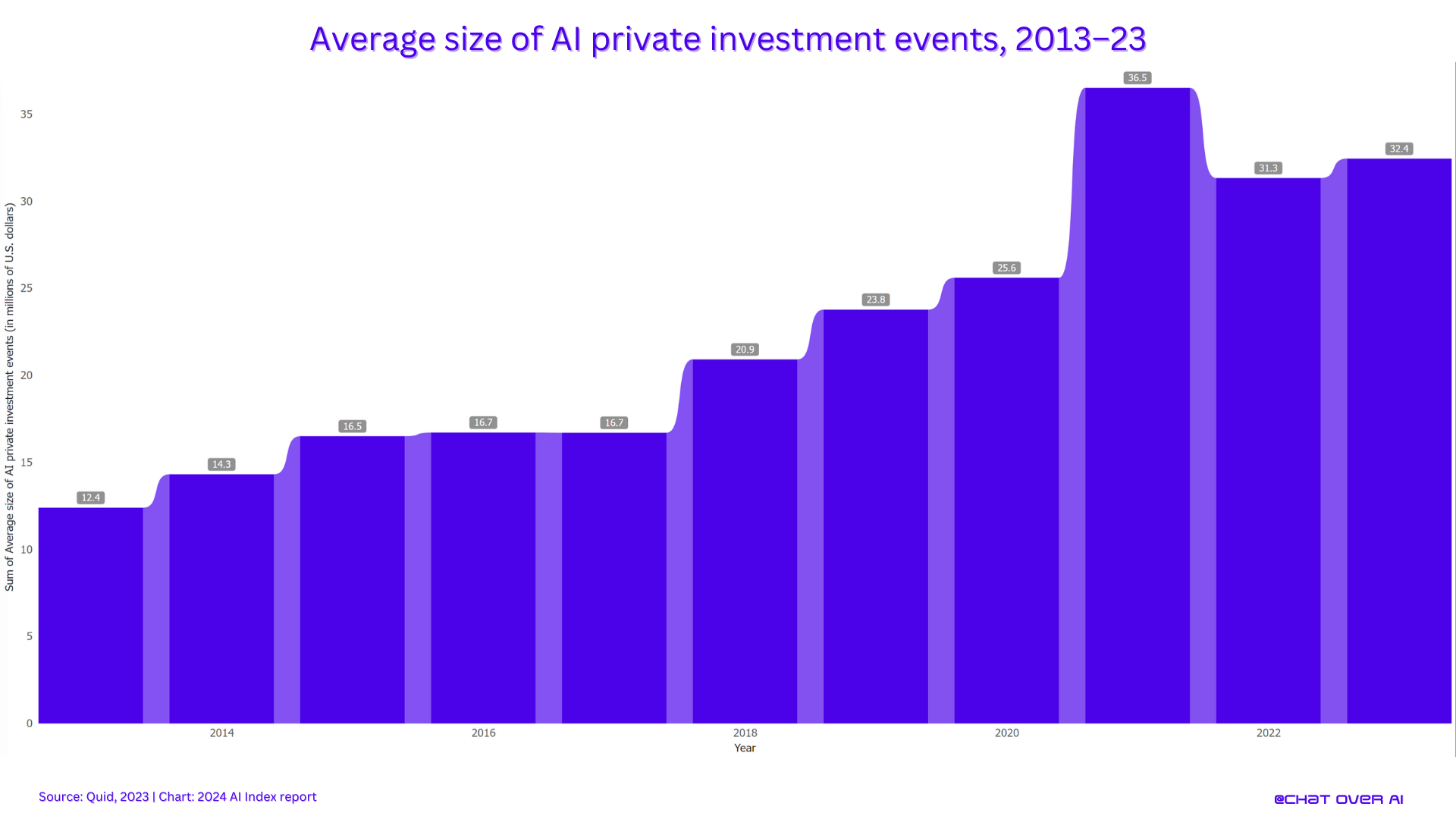 Now let’s talk about the average size of private investment events. shows us how the size of these investments has evolved over the years. From 2013 to 2023, the average private investment grew from $12.4 million to $32.4 million—that's nearly tripling. The latest data, from 2022 to 2023, shows a slight increase, growing from $31.3 million to $32.4 million. You could say investors are getting more comfortable making it rain (in a controlled, calculated way). It’s as if everyone agreed, “Why not add a couple of extra million? What’s a few more bucks between AI enthusiasts?”