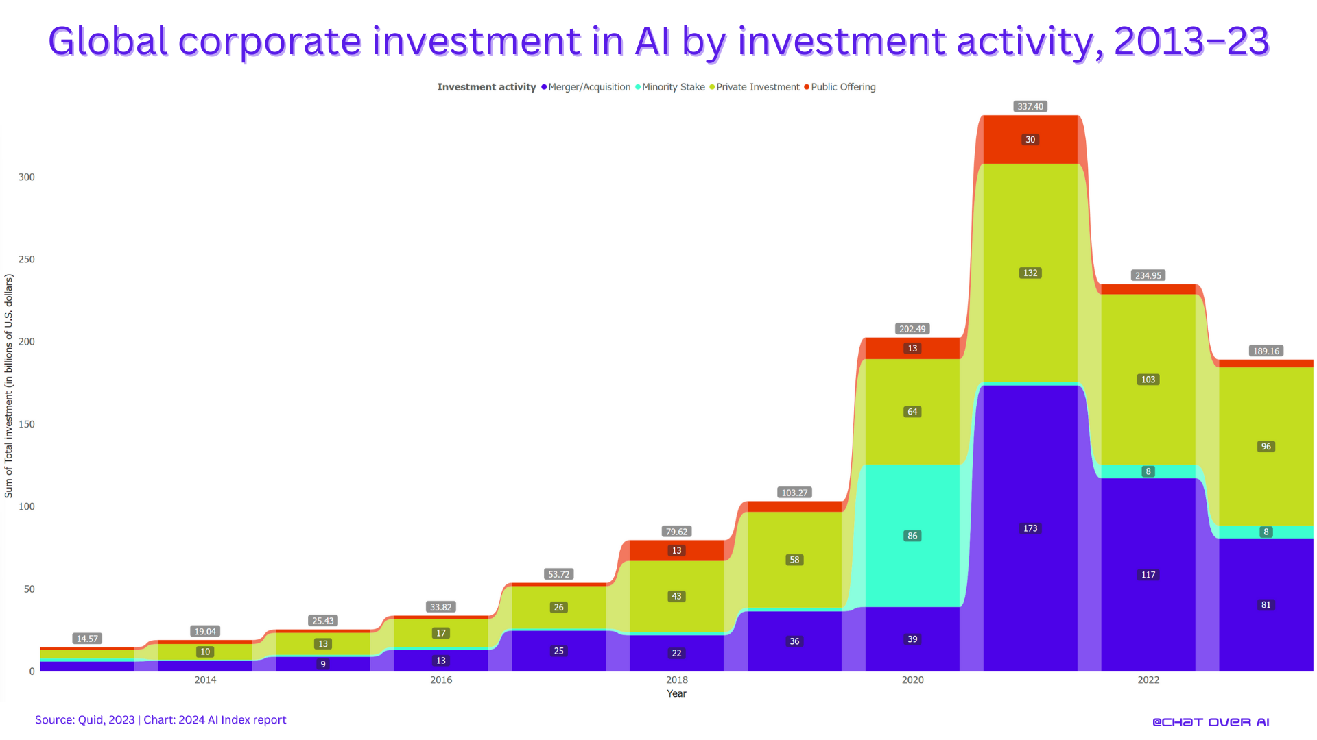 2023 saw a dip in total investment, dropping to $189.2 billion—a solid 20% decrease from 2022. And the biggest contributor to that dip? Well, it turns out that mergers and acquisitions have been a bit shy this year, declining by 31.2%. But hey, if we look at the bigger picture, the thirteenfold increase in investments over the past decade is still enough to get any investor to start practicing their robot dance. It’s not all bad news—it's just that AI investors are maybe getting a little more selective with their billion-dollar bills.