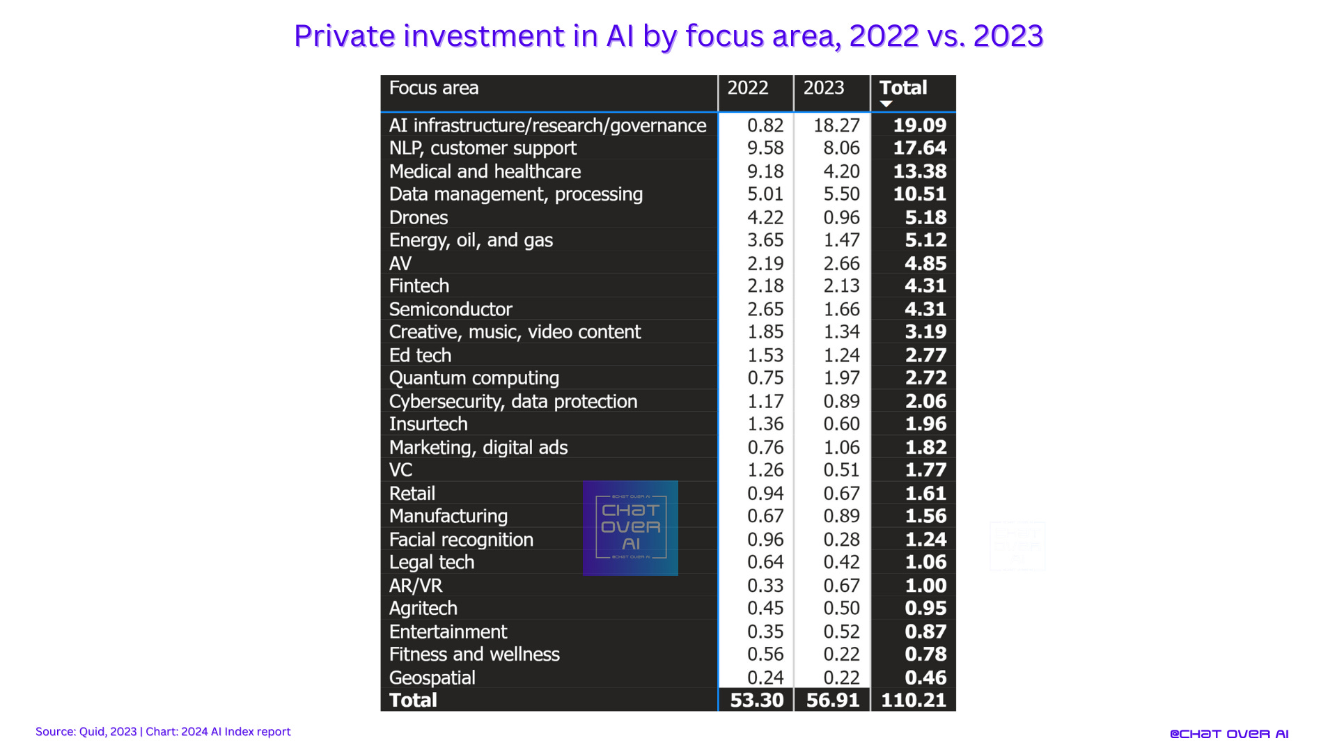 Looking at the changes in AI investments from 2022 to 2023, we can see that the biggest jump occurred in AI infrastructure, research, and governance, which attracted a whopping $18.3 billion in 2023. This shows a significant interest in building the core foundations of AI, from the frameworks and research to the governance mechanisms needed to keep things on track. Think of it as building the world’s fanciest AI treehouse—you need a strong foundation if you want to hang out with the cool tech.