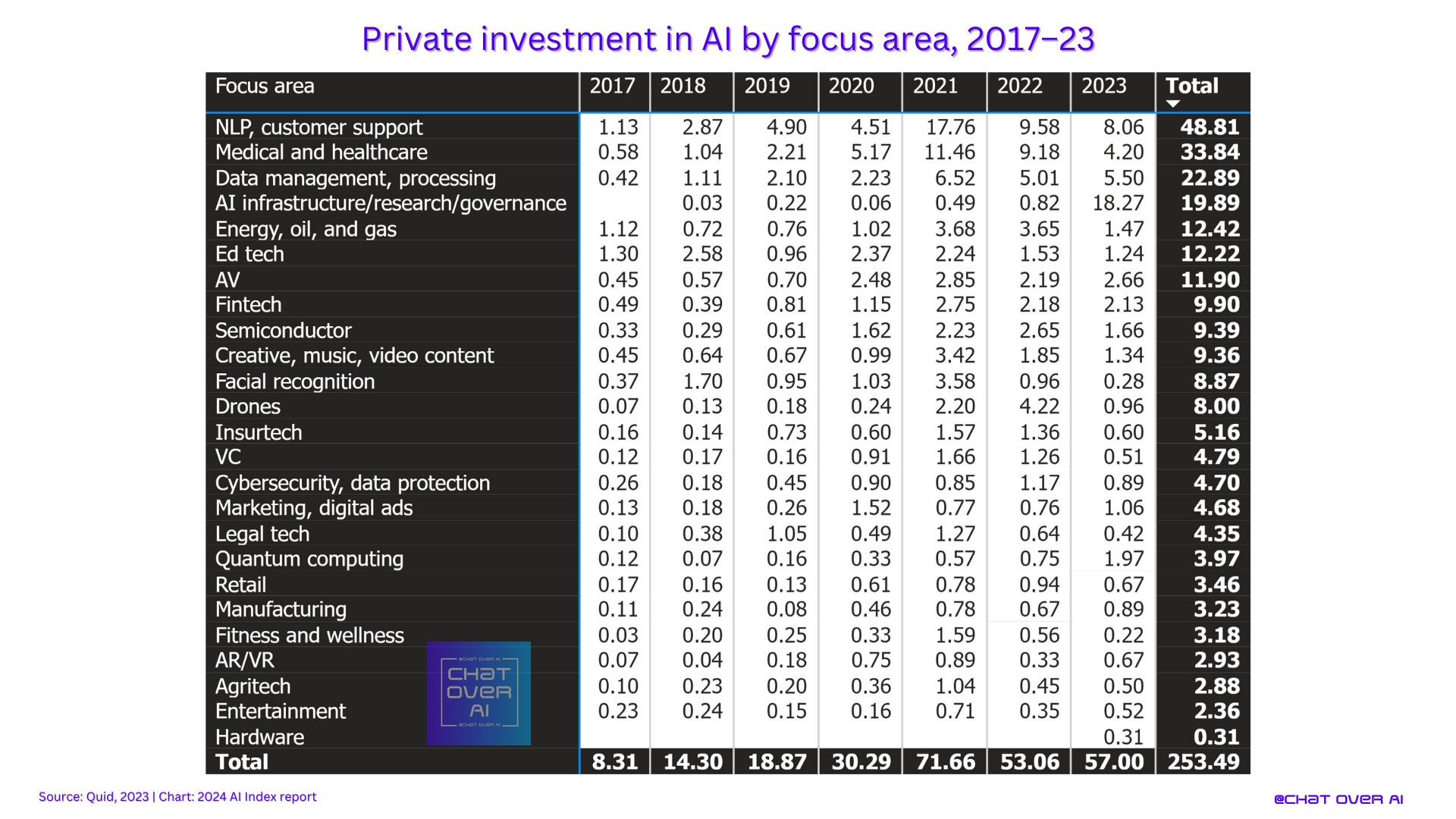 Zooming out a bit, let's take a look at AI investments from 2017 to 2023. The NLP, customer support focus area has led the pack with a cumulative total of $48.8 billion over the years. Healthcare is also a major focus, pulling in $33.8 billion during the same period—proof that the healthcare sector is serious about integrating AI into diagnostics, treatments, and administration. Who wouldn’t want a chatbot diagnosing their next sore throat, right?