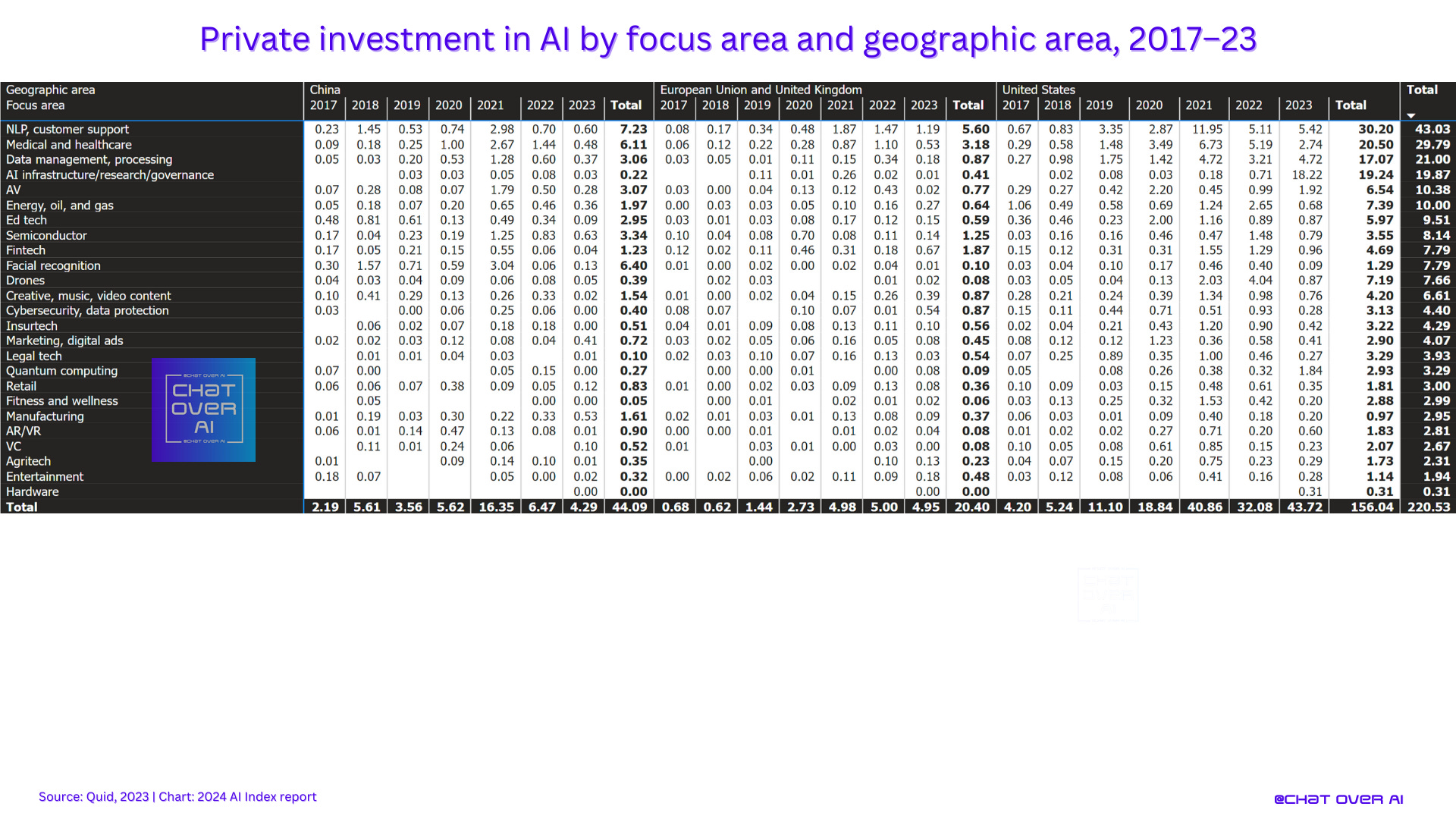 The final table looks at private investment across different regions for various AI focus areas between 2017 and 2023. No surprises here—the United States continues to dominate almost every category. The significant surge in AI infrastructure and governance was led mainly by U.S.-based investments, showing that the country isn’t just interested in AI applications, but also in the foundational research and infrastructure required to lead globally. They’re not just playing with fancy AI toys—they’re building the entire toy factory.