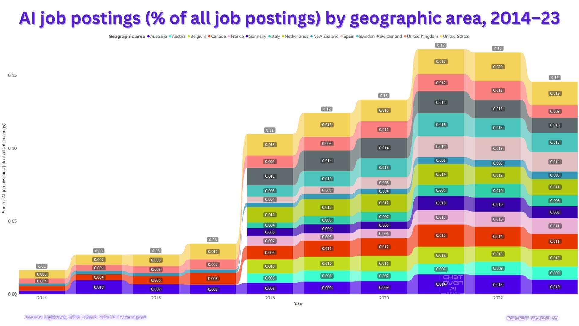 Consistent Rise Since 2014: The chart shows a consistent upward trajectory of AI-related job postings from 2014 to 2023. In 2014, AI job postings represented a small fraction of total job listings—around 0.02% in leading countries. Fast forward to 2023, and we see that number steadily climbing to 0.15% or more in certain regions.