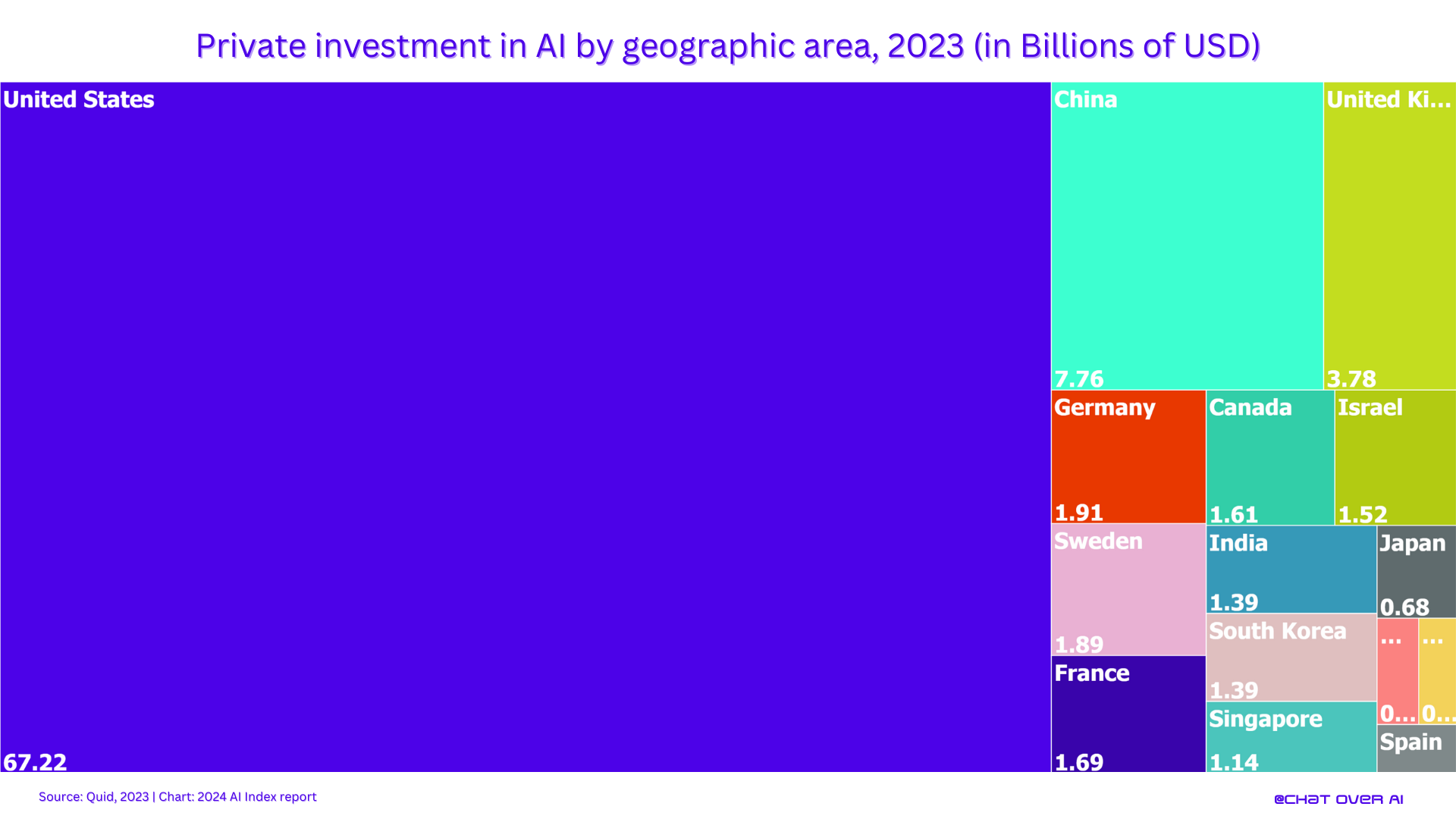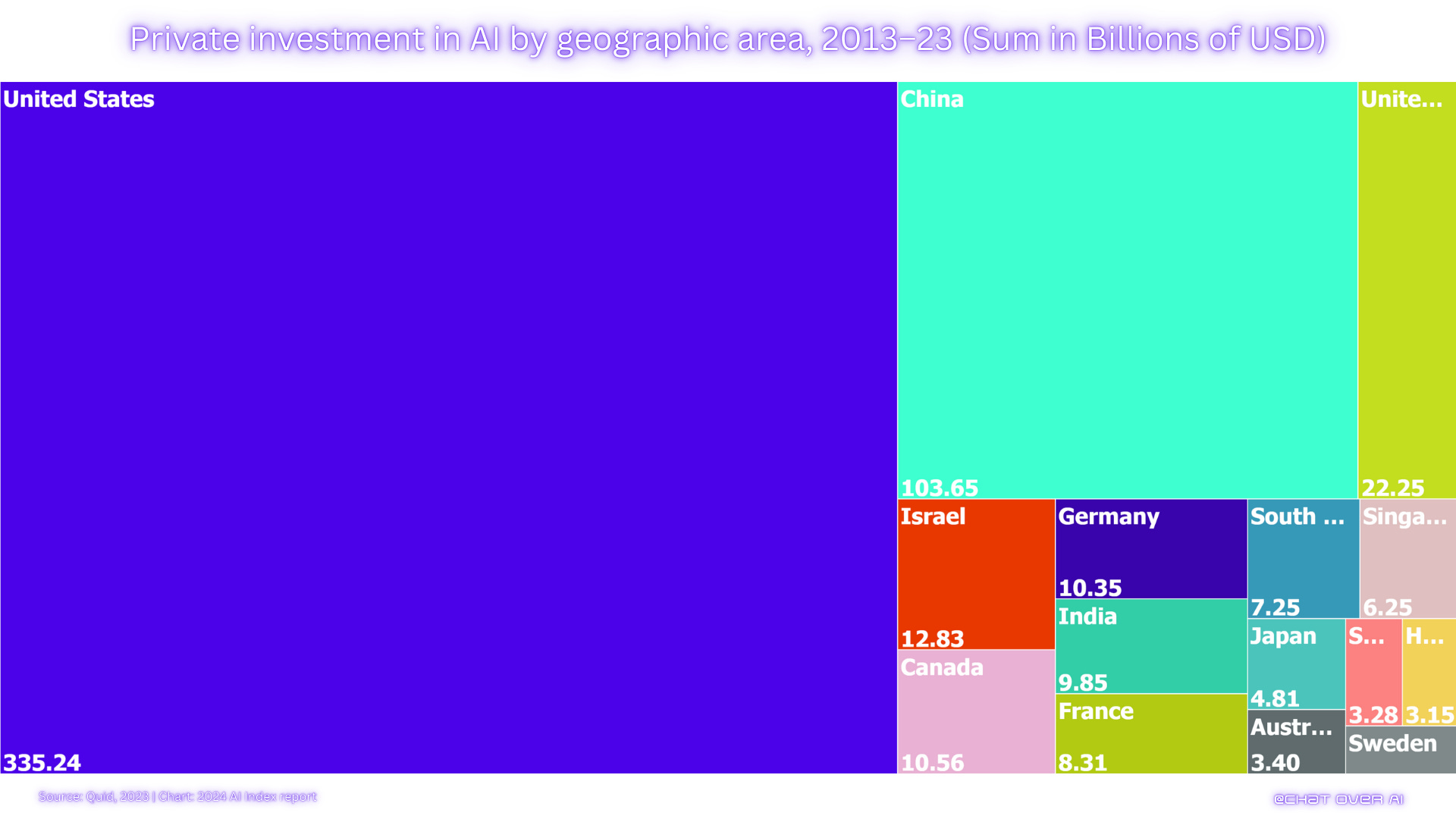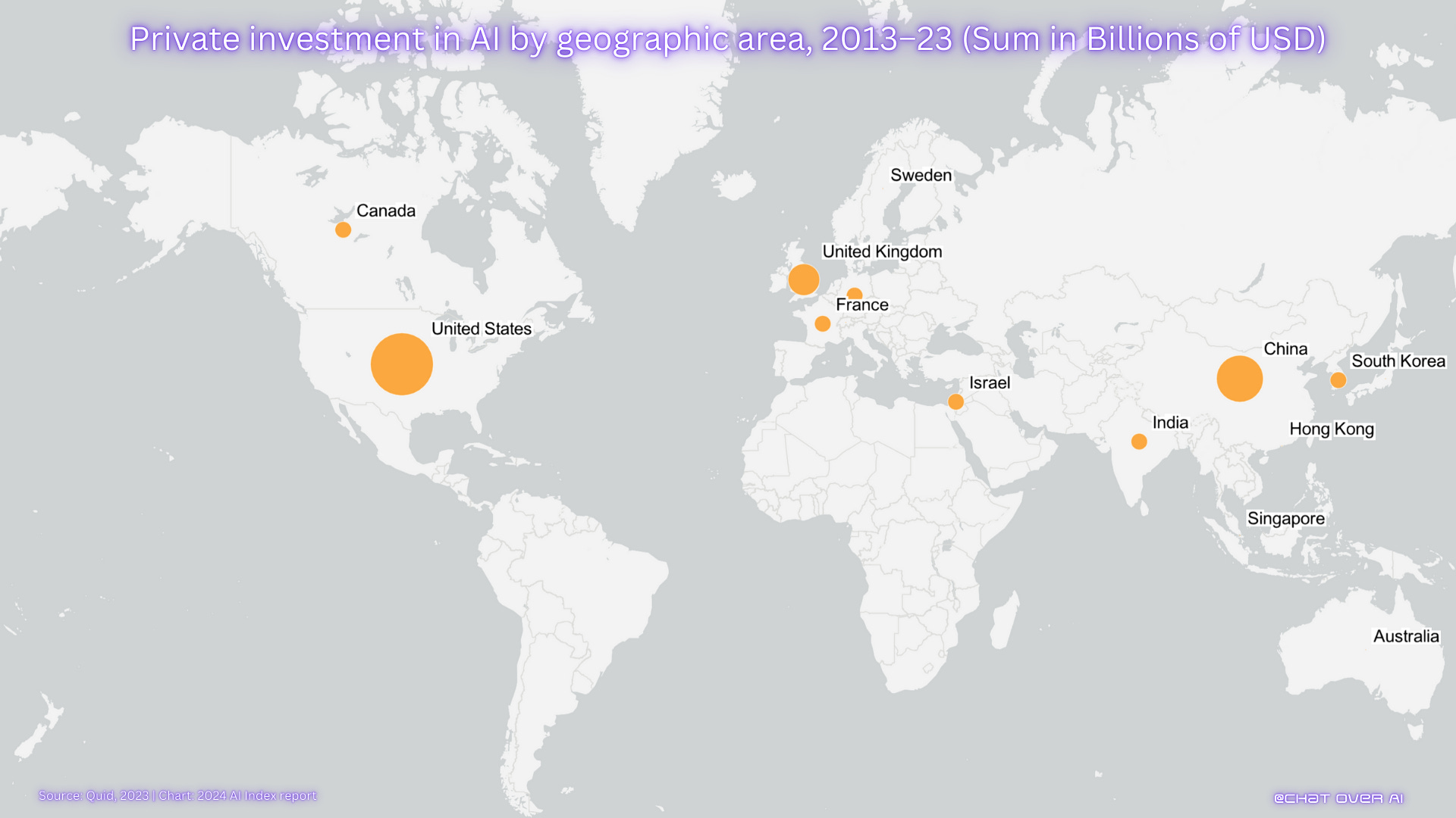 Canada and Germany show up as smaller but still significant dots, while India and Israel have their fair share of orange as well. It’s interesting to see that while the U.S. dominates, there's still a broad interest in AI investments across multiple continents. But, as the map tells us, when it comes to private funding, the size of the investment really does matter—and the U.S. is leading by a wide margin.