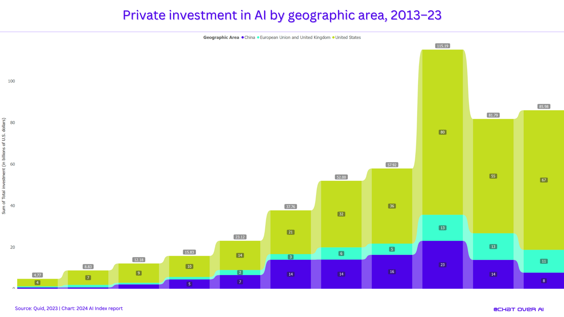 Finally, Chart 5 shows how the gap in private AI investments between the United States and other regions is widening over time. While investments in China dropped by 44.2% and those in the European Union and United Kingdom fell by 14.1% since 2022, the U.S. has seen a solid 22.1% increase during the same period. It’s like the U.S. got a second wind, while everyone else is catching their breath.